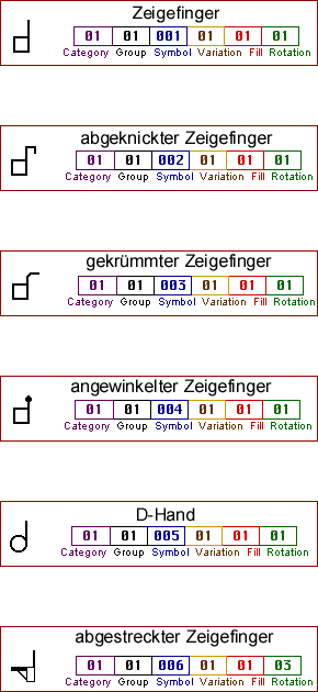 Jede Gruppe wird wiederum unterteilt in Untergruppen: Kategorie 01 Handformen Gruppe 01 Zeigefinger :
