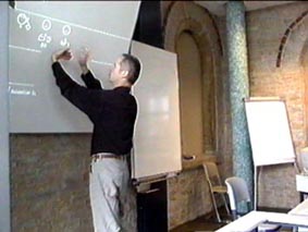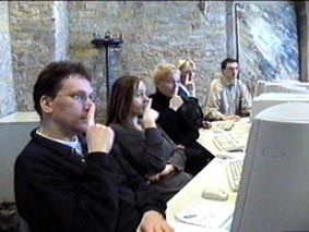 Wir hatten hervorragende Lernbedingungen ! Hier erläutere ich gerade ein GebärdenSchrift-Symbol. Da das Programm SignWriter 4.4 unter DOS läuft, muss man sich zunächst ein wenige auf die Umkehrfarben einstellen. |