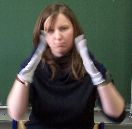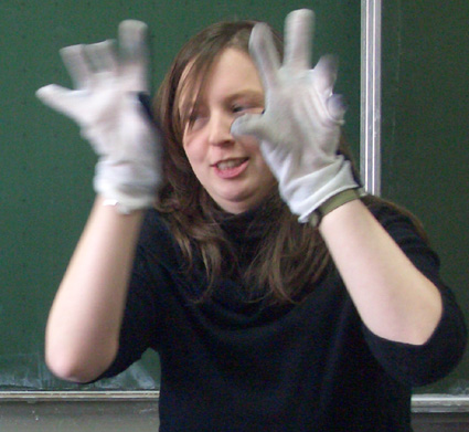 Kathleen und Sara legen wert darauf, dass die Kinder in Belgien auch handschriftlich die GebärdenSchrift beherrschen. Also zeigten sie noch kurz, wie sie das dort unterrichten . Mit ihren speziellen GebärdenSchrift-Handschuhen will Sara das Prinzip der Schreibweise für den Handrücken und die Handfläche verdeutlichen.