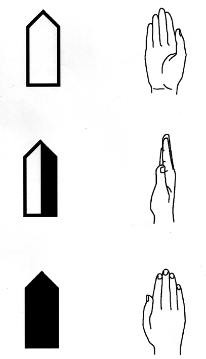 Beim Gebärden ist die Handstellung - also die Ausrichtung der Hand im Raum - von hoher Bedeutung. Bei der Verschriftlichung müssen verschiedene Handformen und Handstellungen hinreichend exakt beschrieben werden. Wenn man das Prinzip erst einmal verstanden hat, ist es sehr einleuchtend und einfach! Betrachten wir zunächst drei verschiedene Handstellungen der Flachhand. Das Symbol für die Handform (Flachhand) ist uns ja bereits vertraut.