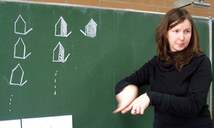 Kathleen und Sara legen wert darauf, dass die Kinder in Belgien auch handschriftlich die GebärdenSchrift beherrschen. Also zeigten sie noch kurz, wie sie das dort unterrichten . Mit ihren speziellen GebärdenSchrift-Handschuhen will Sara das Prinzip der Schreibweise für den Handrücken und die Handfläche verdeutlichen.
