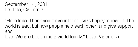 Die Übersetzung lautet : Hallo Frau Valerie Sutton, ich habe einen Film im Fernsehen gesehen. Darüber war ich sehr erschrocken. Danny hat mir Bescheid gesagt. Dann habe ich den Film auch gesehen. Fürchterlich - das Flugzeug fliegt gegen das Hochhaus. Das Hochhaus stürzt ein. Da ist Schmutz und Qualm - da ist auch Feuer. Hallo Valerie , hast du gesehen, wie das Hochhaus eingestürzt ist ? Tschüss Irina |