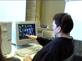 Wir hatten hervorragende Lernbedingungen ! Hier erläutere ich gerade ein GebärdenSchrift-Symbol. Da das Programm SignWriter 4.4 unter DOS läuft, muss man sich zunächst ein wenige auf die Umkehrfarben einstellen. |